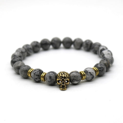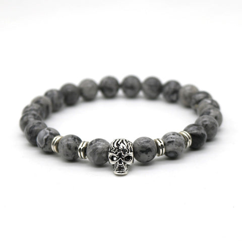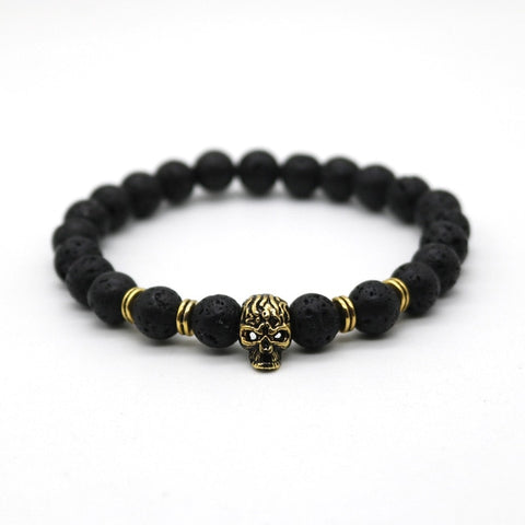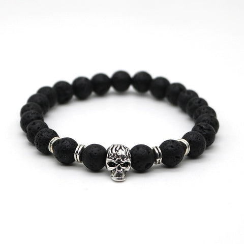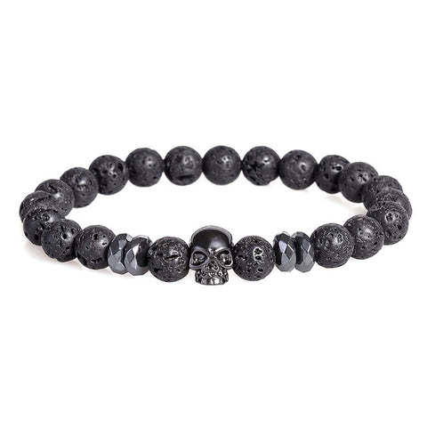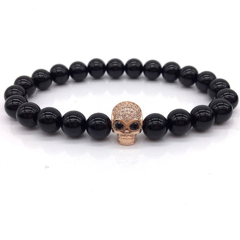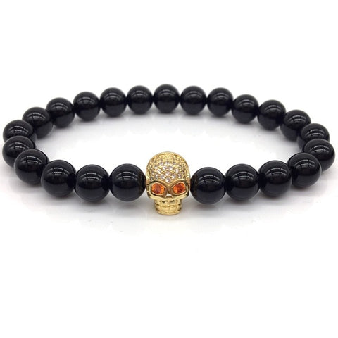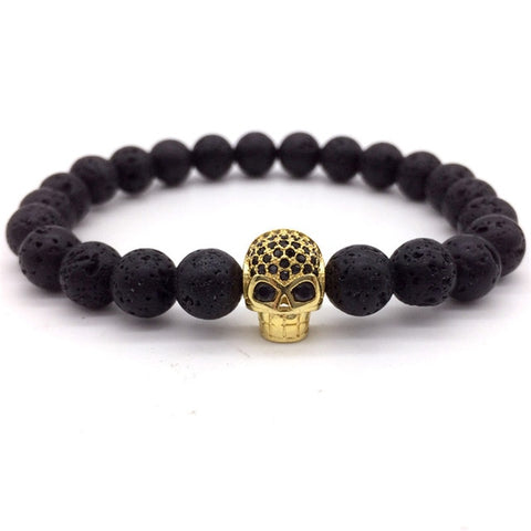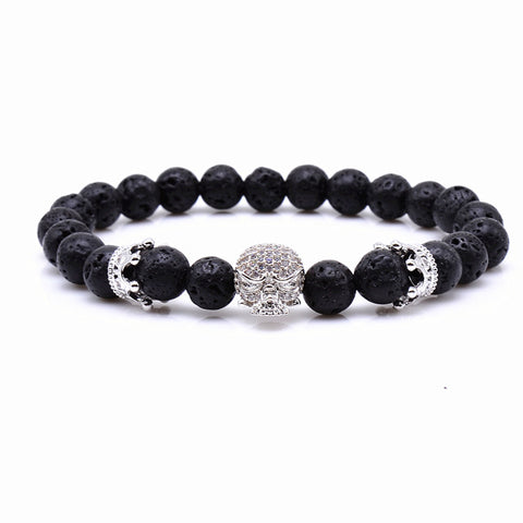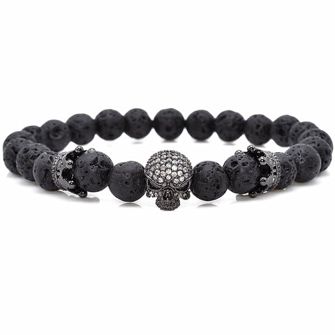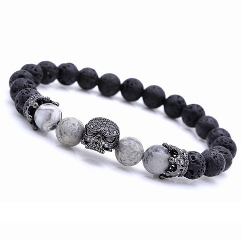 Brand Trendy Natural Beads Strand Bracelet Micro Pave CZ Skeleton Skull Black Lava Rock Stone Energy Men European Buddha Jewelry