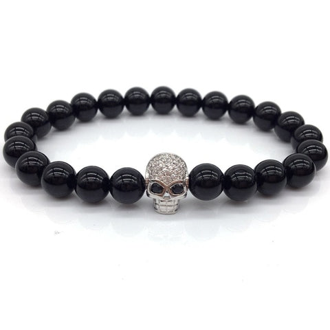 Brand Trendy Natural Beads Strand Bracelet Micro Pave CZ Skeleton Skull Black Lava Rock Stone Energy Men European Buddha Jewelry